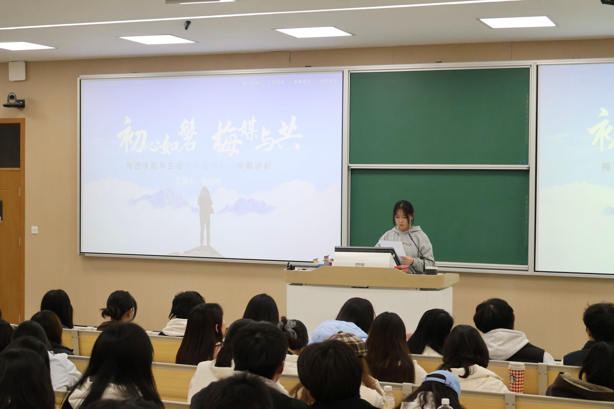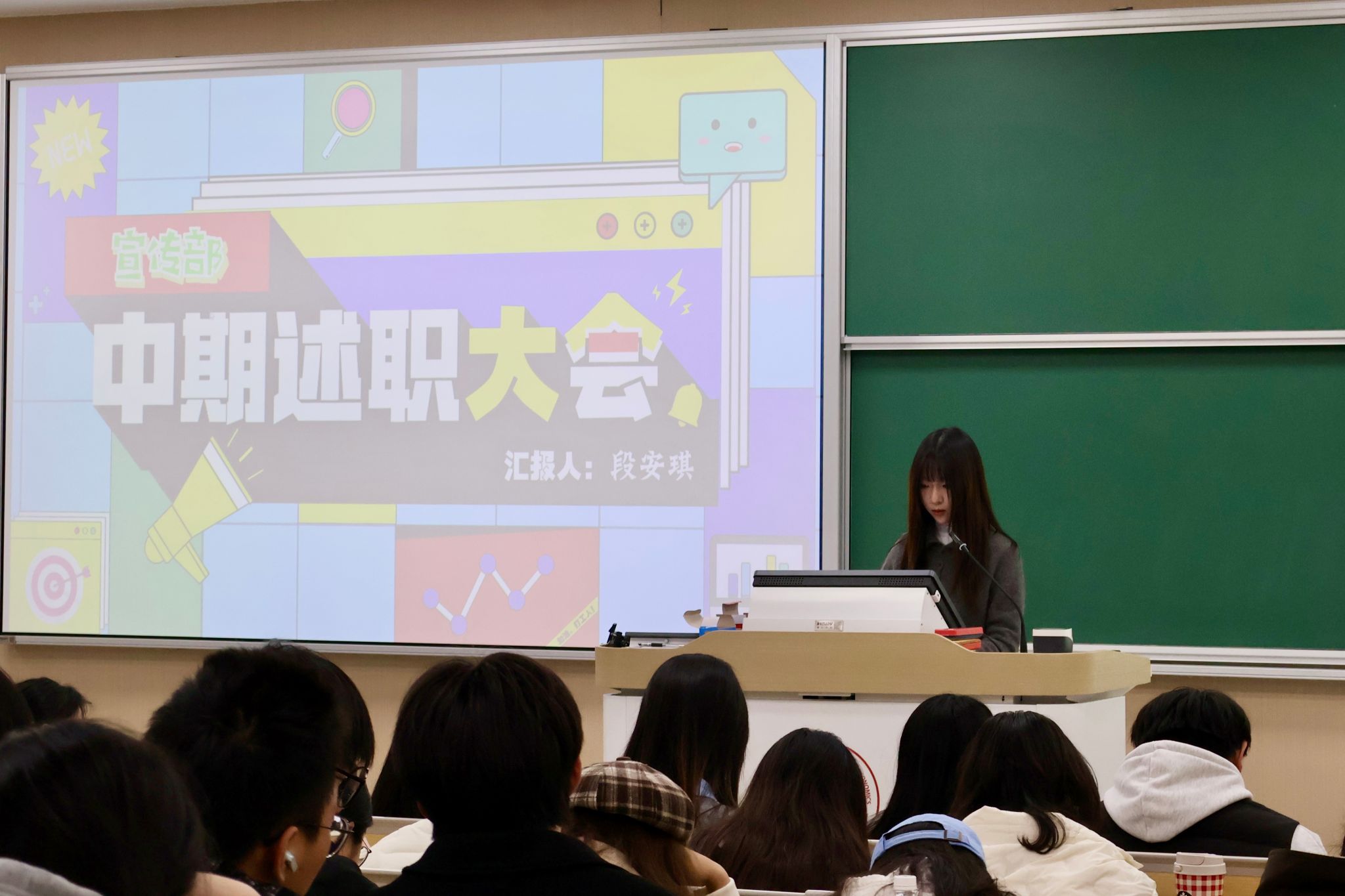 随后,团学各部门代表依次登台“亮答卷”。各部门代表从活动数据、成果案例等维度,清晰展现本学期工作成绩;以流程疏漏、协作短板为切入点,坦诚反思实践中的待改进之处;围绕“服务同学、联动学院”的核心,明确了下一阶段创新活动策划、部门协同机制等具体规划。台上分享干货满满,台下记录与互动交织,会场氛围既严谨务实,又热烈鲜活。