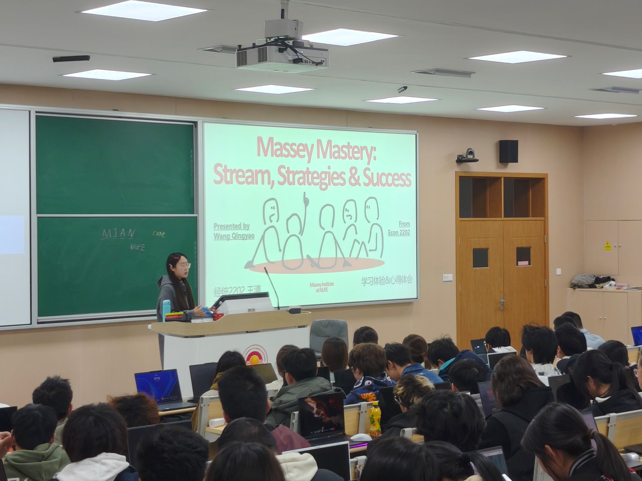 最后,2022级学生代表王清瑶结合自身学习经历,分享了全英文学习心得与经验。她从课堂听讲、作业完成到考试准备等多个环节,详细讲解了如何克服语言障碍、提升梅西课程学习效率。此外,她还就如何主动与外教进行有效沟通、如何利用好梅西大学的教学管理和学籍系统分享了实用技巧,其亲切而真诚的分享引起了在场学生的浓厚兴趣和热烈反响。