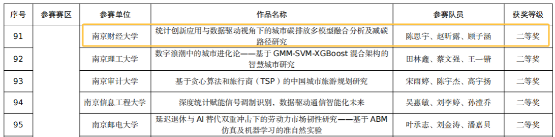 10月26日,2025年(第十一届)全国大学生统计建模大赛全国总决赛在东北财经大学落下帷幕。我院陈思宇、赵昕露、顾子涵三位同学在张志旺老师的精心指导下,参赛作品《统计创新应用与数据驱动视角下的城市碳排放多模型融合分析及减碳路径研究》经过通讯评审、会议评审和现场答辩,最终荣获国赛二等奖。