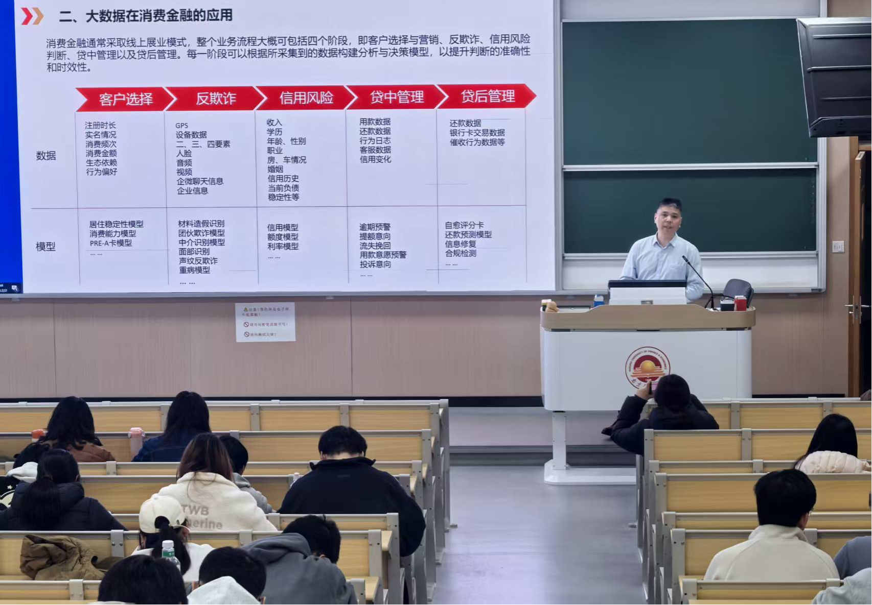 朱正祥博士围绕“大数据在信贷业务中的实际应用”“相关技术方法与模型解析”以及“行业对人才的能力需求”三大方向展开分享。他系统阐述大数据如何贯穿贷前审核、风险定价、贷中监控、贷后管理等信贷全流程,并结合自身在苏宁、海尔、南京银行等企业的实战经历,生动剖析了数据建模、反欺诈算法、智能风控等关键技术的落地场景。他强调,个人信贷领域的数字化发展,亟需既懂数据科学又懂金融业务的复合型人才,鼓励同学们在学业阶段夯实数理基础、培养业务思维、保持技术敏感,为未来职业发展筑牢根基。