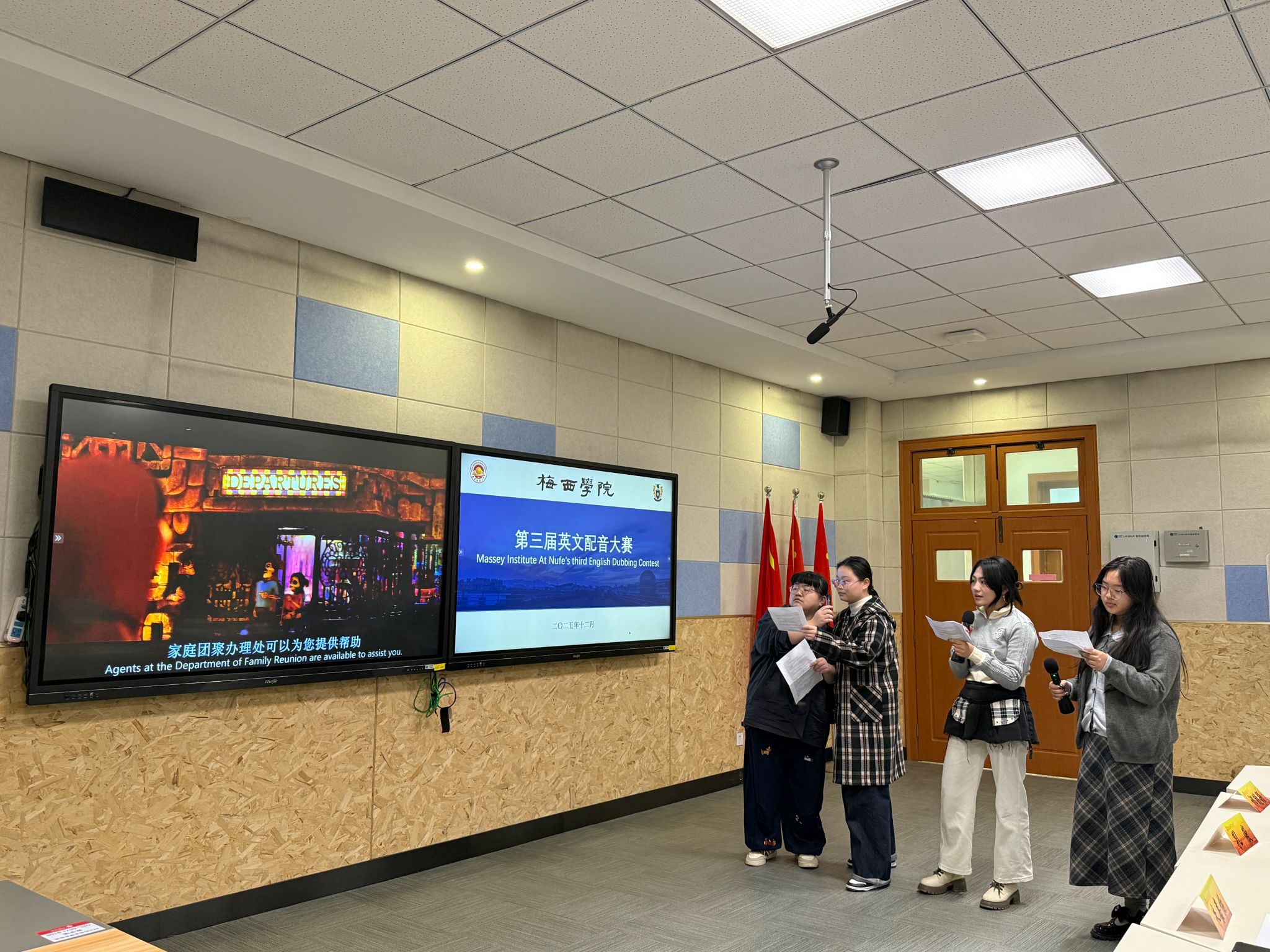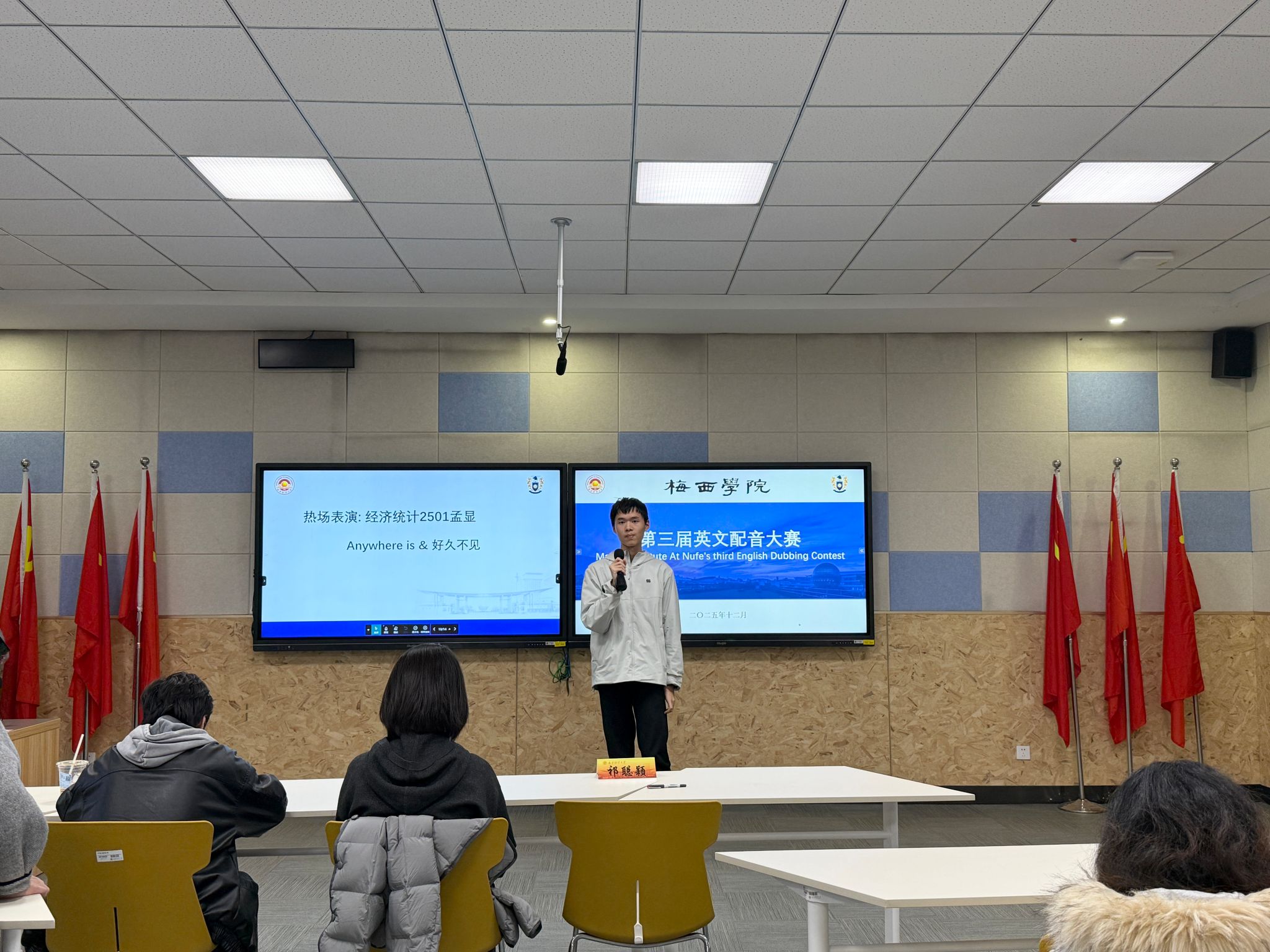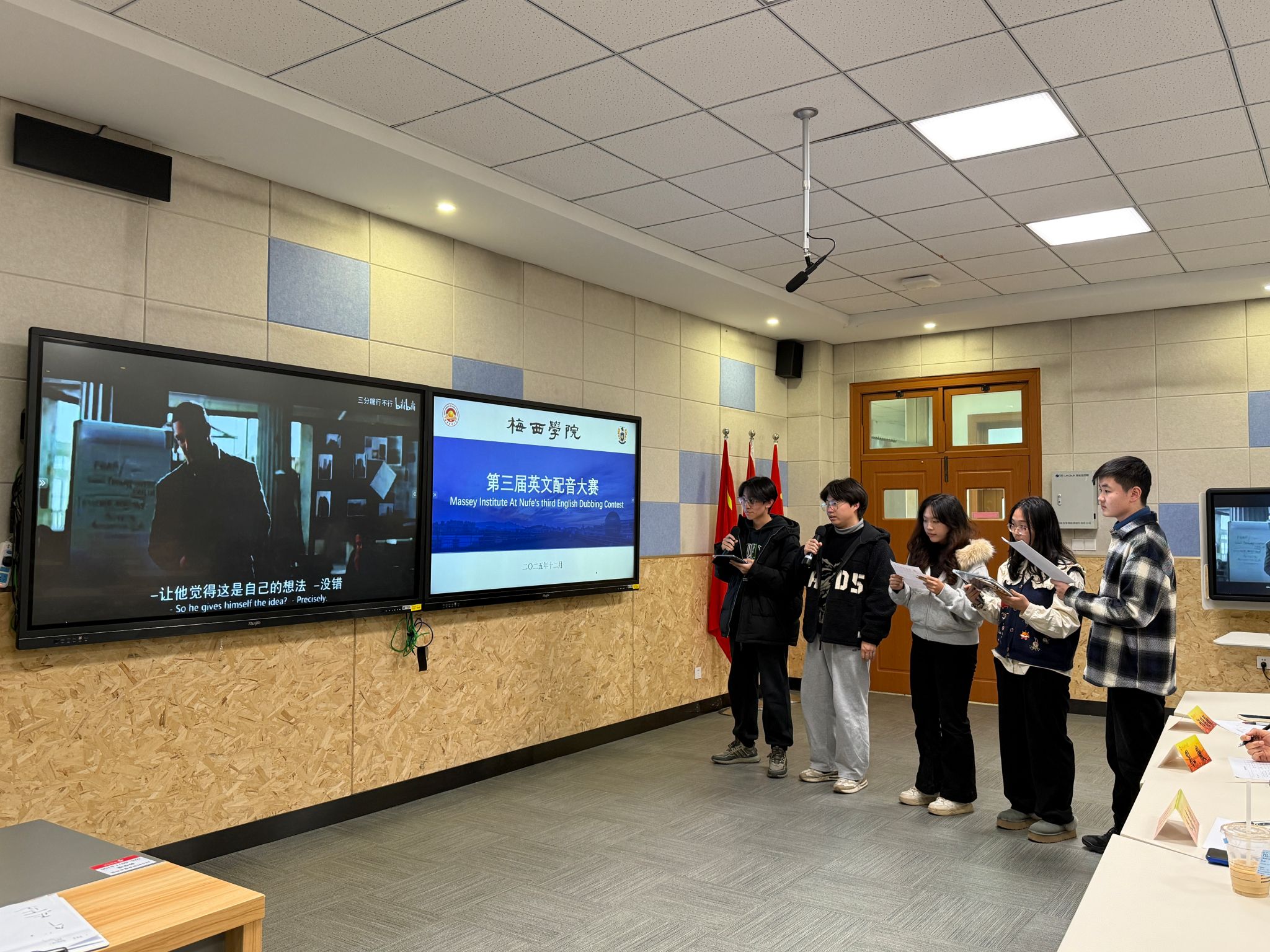 为深化英语教学实践,激发学子跨文化表达热情,我院第三届英文配音大赛于12月10日下午在博文楼101智慧教室精彩启幕。我院副院长孔傲、团委书记祁聪颖、学生会轮值主席朱嘉怡担任大赛评委。