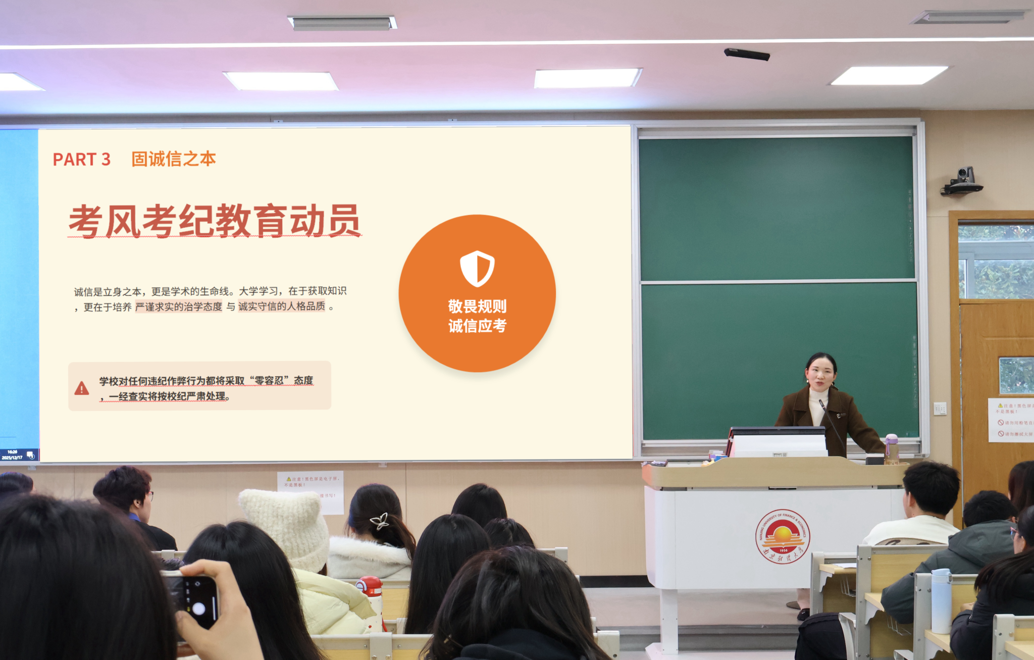 魅力班级项目启动会后,杨成凤老师开展考试考风考纪教育及相关学习教育。她就考试纪律要求、考场秩序等方面进行详细说明,重点强调了考试作弊的严重后果,要求同学们认真备考,严格遵守考场纪律,坚决杜绝作弊行为。同时,她还带领新生共同学习了关于诚信资助、安全反诈、评奖评优、公寓管理、第二课堂、劳动教育等相关内容。