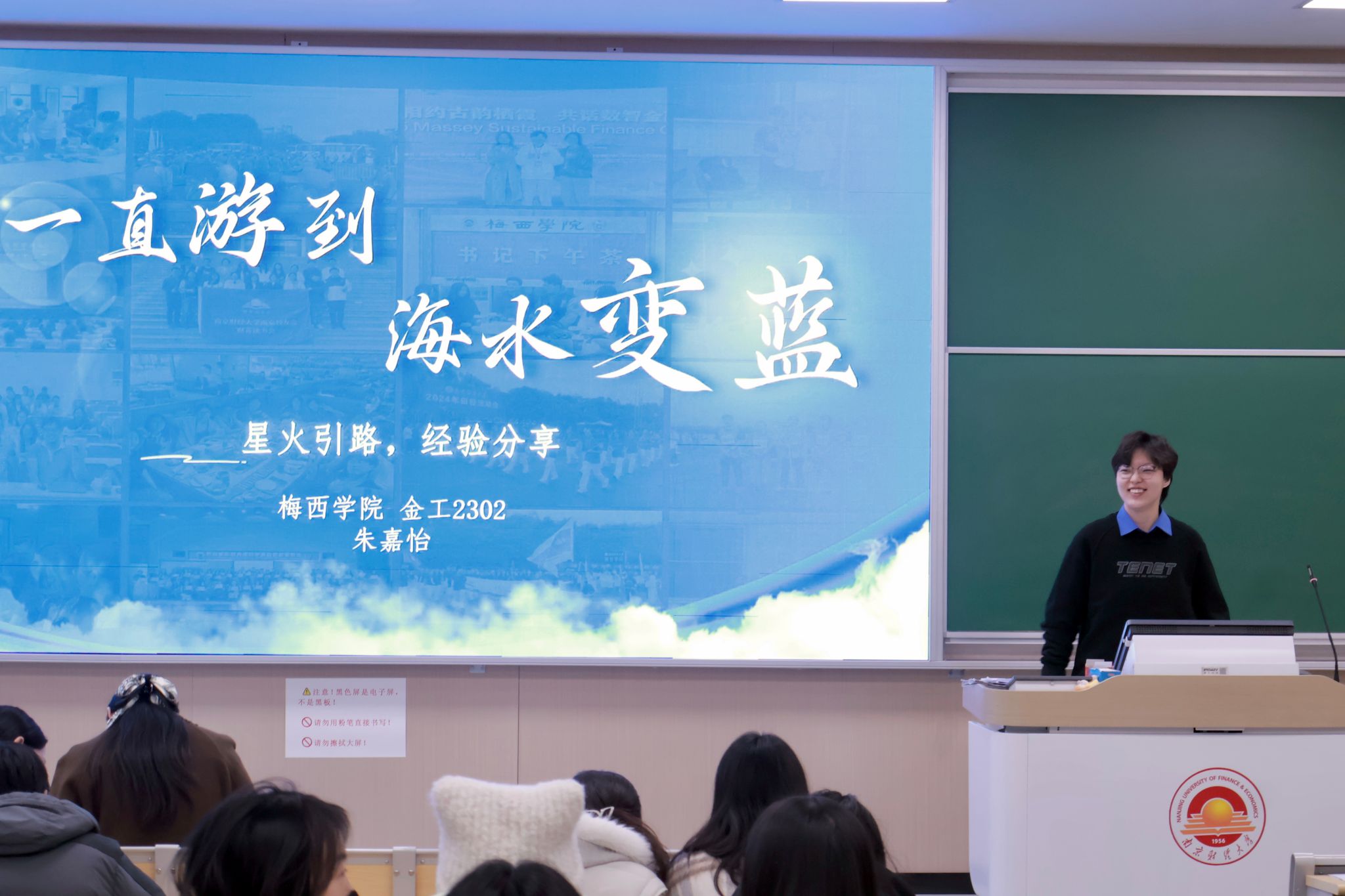 为了让新生今后努力的方向更加明确,在班级风采展示后,2025年度南财好青年获得者、院学生会轮值主席朱嘉怡学姐为新生作经验分享。她指出,优异的学习成绩以及丰富的课余志愿活动必不可少,只有这样才能不断提升自我、综合发展。同时,作为过来人,她建议学弟学妹们在今后的学习生活中,要巩固学业根基、优化学习路径、积极调适心态,向着既定目标一步一个脚印慢慢前进、厚积薄发。